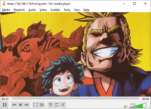 It is also possible to see the RTMP output using the URL rtmp://192.168.1.18/live/spynet, where live is the name of the application we configured and spynet is the streaming key.
