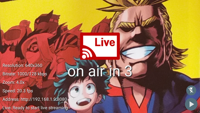 To start the stream use the arrow icon in the bottom-right corner of the main screen. By tapping on it a countdown will be shown, at the end of which the device will connect to nginx.